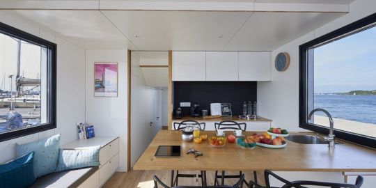Sealoft entwickelt rechteckige, schwimmende Häuser mit einer Fläche von ca. 48 Quadratmetern, die auf das Leben am Kai oder auf Binnengewässern ausgerichtet sind. Ihre offene und helle Architektur legt Wert auf Wohnkomfort und landschaftliche Integration.
