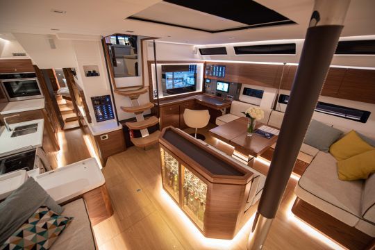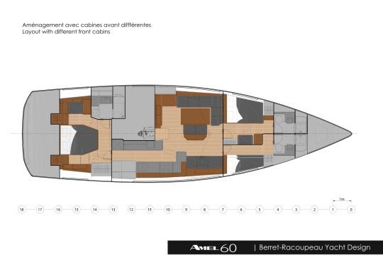 Dieses Modell Amel 60 wird in einer überarbeiteten Version der Innenausstattung präsentiert. Die riesige Achterkabine bleibt dem Eigner vorbehalten, während die beiden vorderen Kabinen neu gestaltet wurden: eine Doppelkabine mit Sessel und Schminktisch und eine Kabine mit Etagenbetten. Jeder Raum behält seine eigene Nasszelle. Diese neue Anordnung soll den immer häufigeren Anfragen von Eignern gerecht werden, die ihre Familie oder ihre Crew an Bord nehmen möchten.